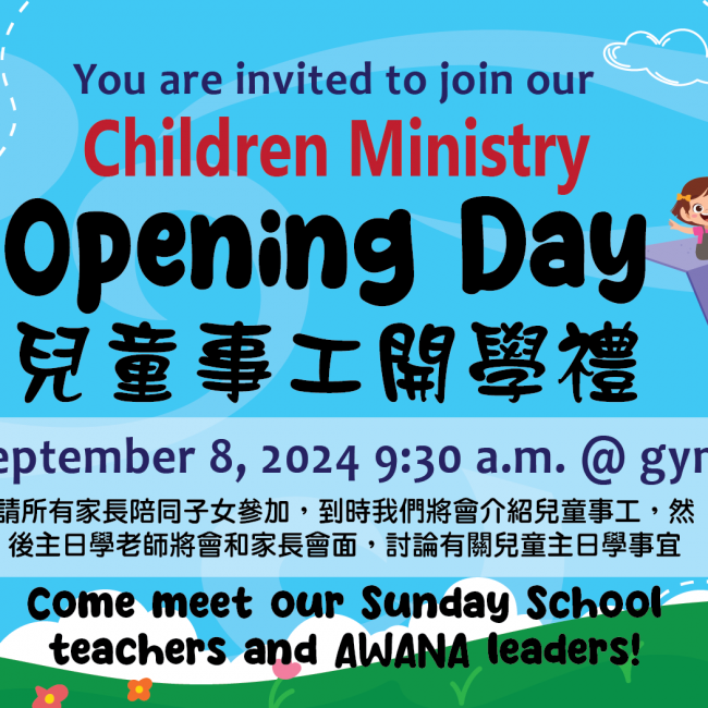 備註:請所有家長陪同子女參加,到時我們將會介紹兒童事工,然後主日學老師將會和家長會面,討論有關兒童主日學事宜。詳情請看海報。