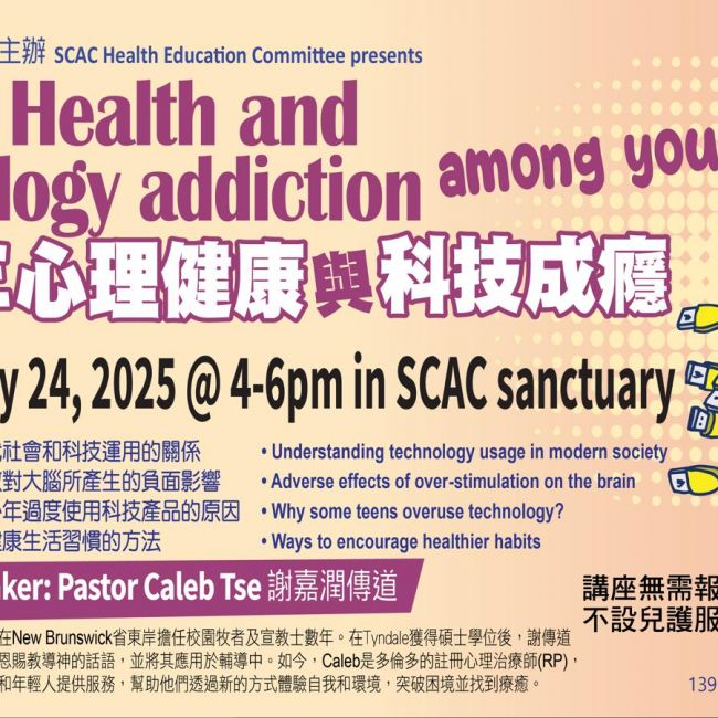SCAC Health Education Committee presents ‘Mental Health & Technology Addiction Among Youths’ English seminar by Pastor Caleb Tse, registered psychotherapist, on Saturday, May 24 at 4-6pm in SCAC main church sanctuary. See attached poster for details.