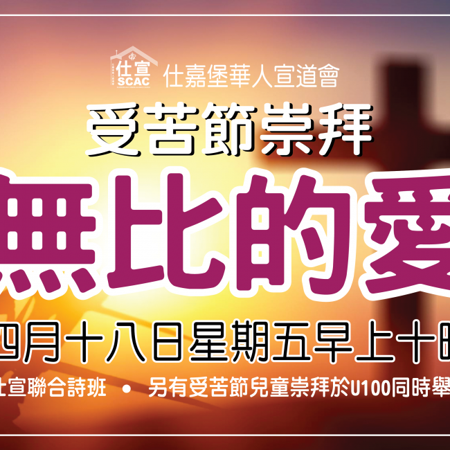 英語受苦節崇拜: 與數間宣道會聯合, 於下午4:00 在仕宣大堂舉行。