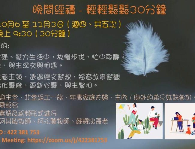 參加/形式:歡迎主堂、北堂、國語堂,主內 / 海外姊妹們參加。聚會由經驗導師帶領,以粵語及Zoom視頻形式進行,無需報名。