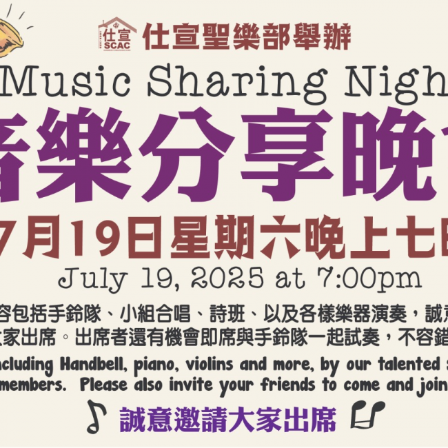 聖樂部舉辦綜合音樂分享晚會,內容包括手鈴隊、小組合唱、詩班、以及各樣樂器演奏,誠意邀請大家出席。出席者還有機會即席參與手鈴隊⼀起試奏,不容錯過。