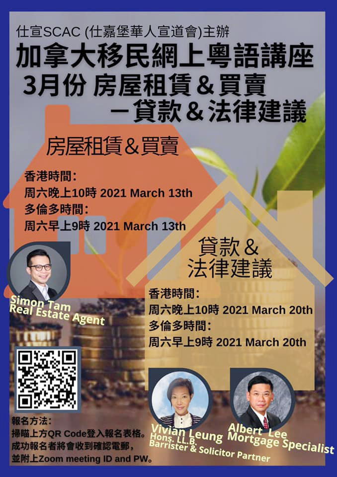 房屋租賃、買賣、貨款及法律建議。 報名方法:請到https://forms.gle/QRoFXzvs67ARa6vb8 登記索取Zoom ID