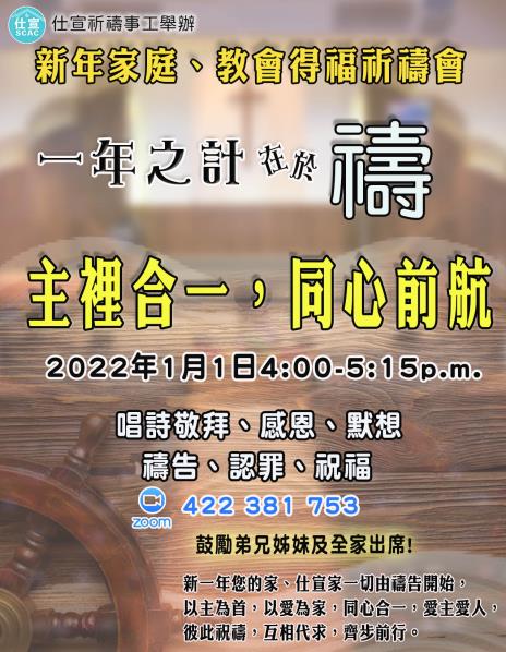 「主裡合一, 同心前航」鼓勵兄姊及家人一同參加! 日期:2022年1月1日 時間:下午4:00-5:15 地點:網上舉行 Zoom ID:422 381 753