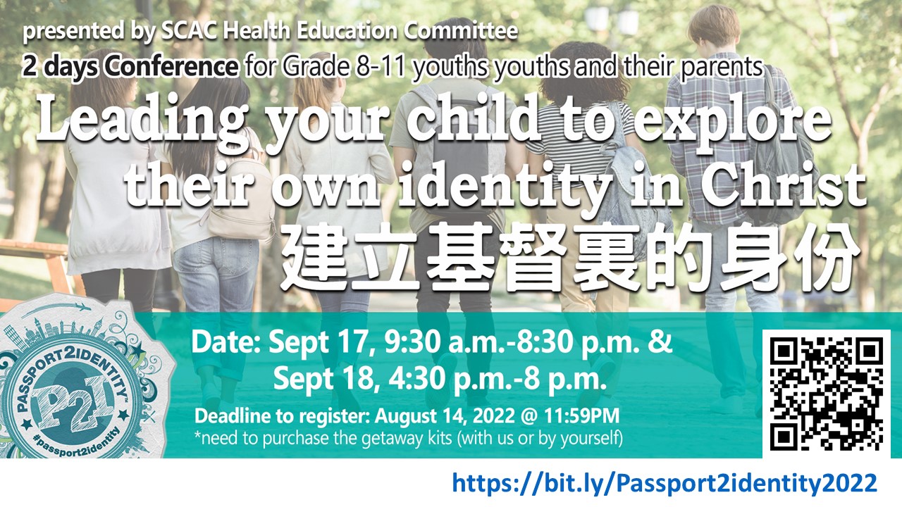 內容:以聖經真理的角度,透過有趣的活動,並家庭關係更親密的體會,誘導青少年面對成長的挑戰。 P2I內容引領父母和青少年之間展開持續的交流,並重新燃點青少年在基督裡堅定立志的信念。 如有興趣參與的家庭,請在 2022 年 8 月 14 日晚上 11:59 之前登入https://bit.ly/Passport2identity2022 註冊。”