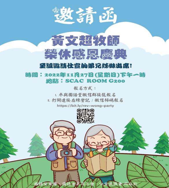 神忠心的僕人黃文超牧師將於今年年底退休,教會為此舉行一個榮休感恩慶典,來紀念黃牧師夫婦的辛勤服侍。