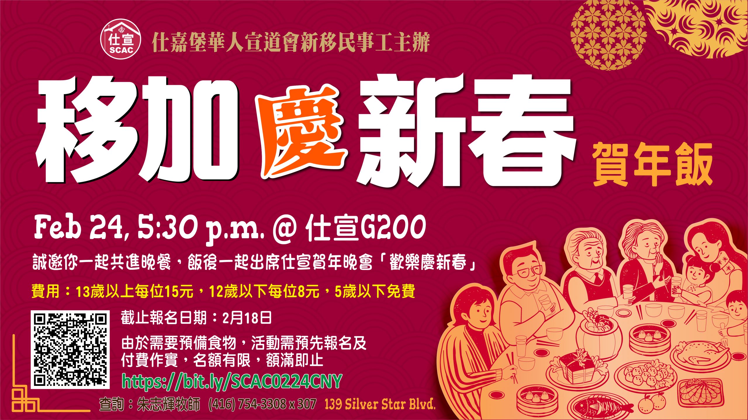 歡迎邀請新移民朋友一起共進晚餐和參與之後教會新春活動。 活動需預先報名及付費作實,名額有限。