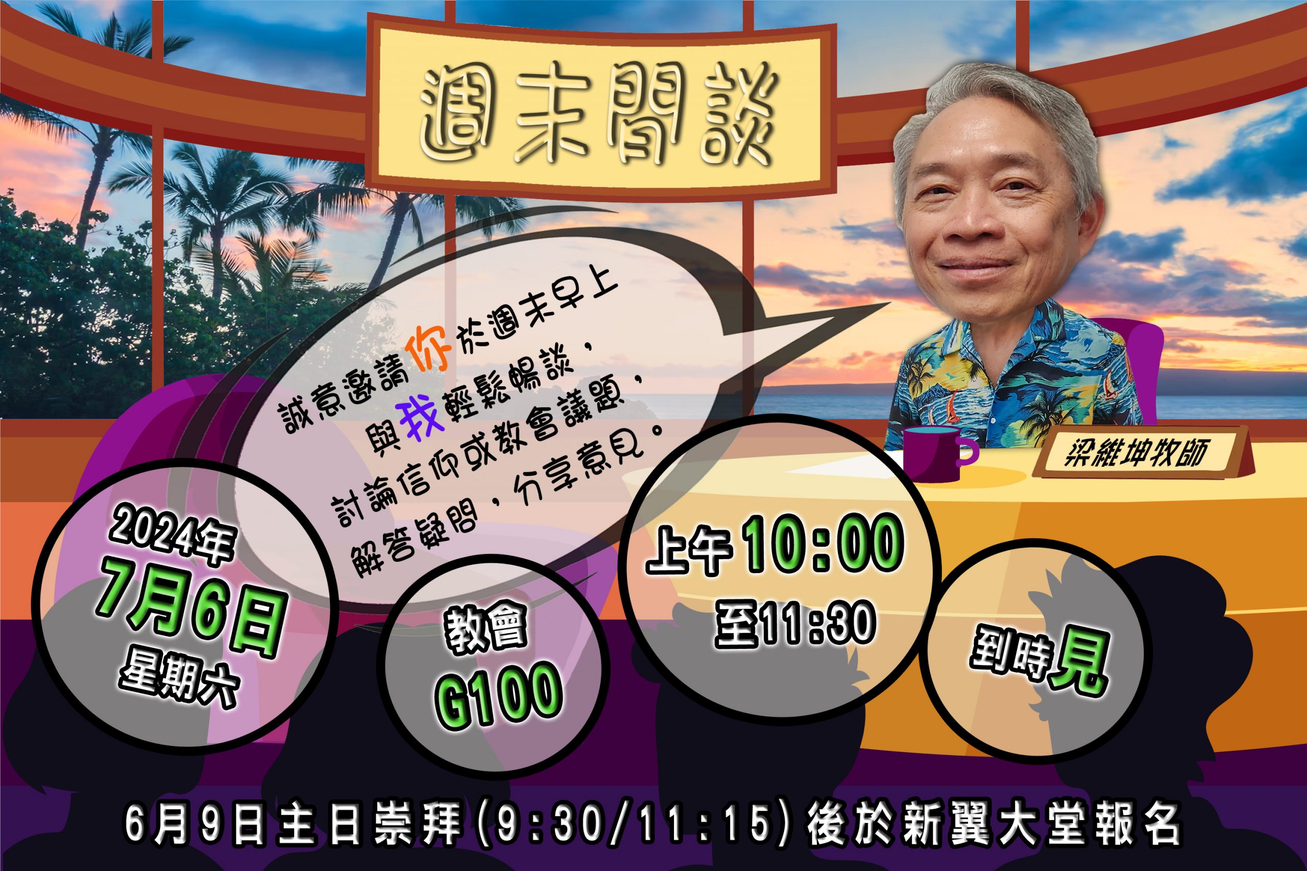 誠意邀請你於週末早上與梁維坤牧師輕鬆暢談,討論信仰或教會議題,解答疑問,分享意見。