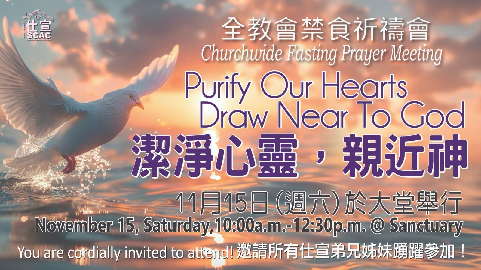 2025-11-15 @ 10:00 上午 - 12:30 下午 全教會禁食祈禱會:「潔淨心靈、親近神」 SCAC 139 Silver Star Blvd., Toronto 日期:11 月 15 日(週六) 時間:上午10:00 – […]