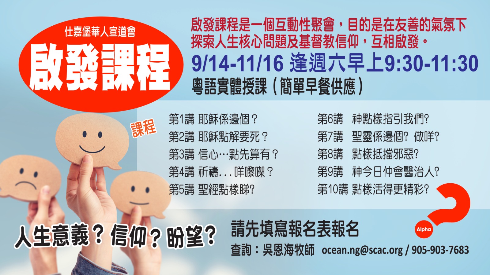 2024-09-14 啟發課程 啟發課程 2024-09-14 @ 9:30 上午 - 2024-11-16 @ 11:30 上午 啟發課程 日期:9月14日至11月16日(逢週六) 時間:上午9:30-11:30舉行 對象:歡迎弟兄姊妹邀請未信主之親 […]