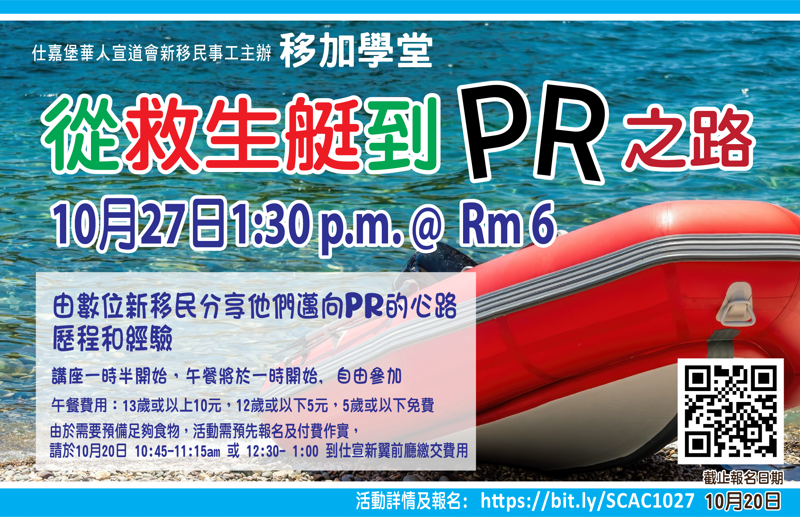 1:30 pm - 3:00 pm 從救生艇到PR之路 2024-10-27 @ 1:30 下午 - 3:00 下午 從救生艇到PR之路 新移民事工活動:「從救生艇到PR 之路」 日期:10月27日 時間:1:30pm 地點:仕宣地庫6號房 內容: […]