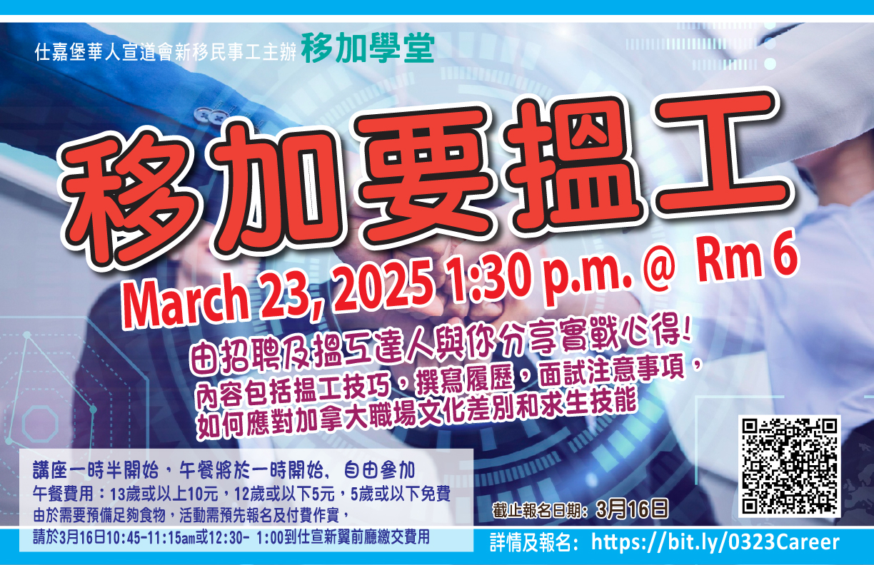 1:00 pm - 3:00 pm 移加要搵工 2025-03-23 @ 1:00 下午 - 3:00 下午 移加要搵工 迎新事工活動:「移加要搵工」新移民事工活動 日期:3月23日 時間:下午1:00 內容:包括揾工技巧,撰寫履歷 […]