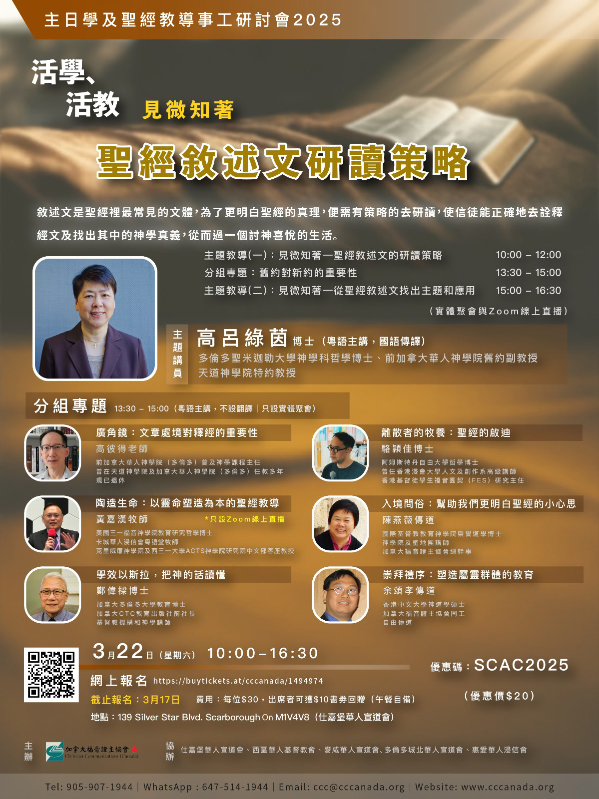 10:00 am - 4:30 pm 聖經敘述文研讀策略 2025-03-22 @ 10:00 上午 - 4:30 下午 聖經敘述文研讀策略 基教部與加拿大證主協會協辦2025主日學及聖經教導事工研討會。 日期:2025年3月22日(六) 時間:10a […]