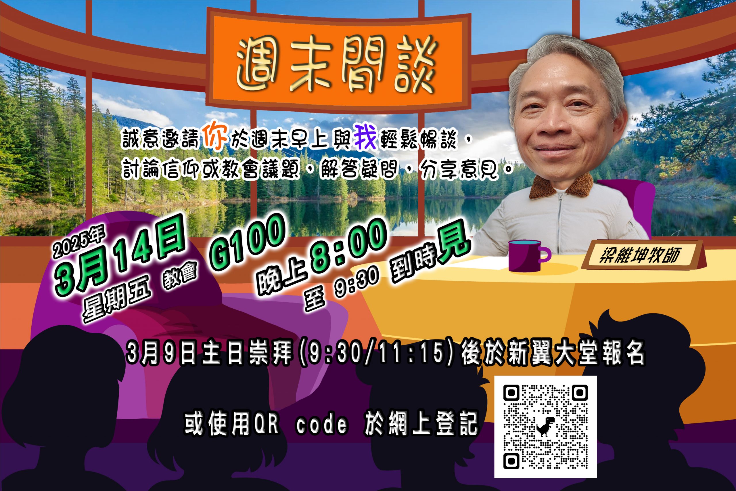 8:00 am - 5:00 pm 週末閒談 2025-02-26 @ 8:00 上午 - 5:00 下午 週末閒談 誠意邀請你於3月中的週末與梁維坤牧師輕鬆暢談,討論信仰或教會議題,解答疑問,分享意見。 日期:3月14日(週五 […]