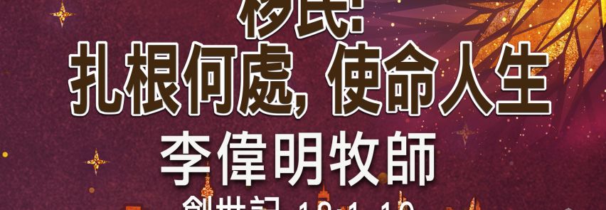 移民:扎根何處,使命人生 李偉明牧師 2024-05-26 粵語講道 創世記12:1-10 彼此的勉勵提醒 先要求神的國和神的義 (太6:33) 為身處的國家去「求平安」(耶29:7) 學習「歸回安息,得力,平靜安穩」(赛30:15) Share: Post navigation ← 「若不是耶和華建造…」 預備主再來 →