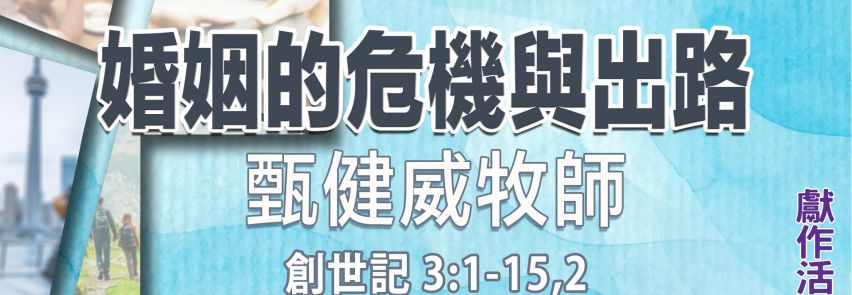 婚姻的危機與出路 嘉賓講員 2026-04-19 客席講員, 粵語講道 講員:甄健威牧師 創世記 3:1-15,21 婚姻的危機一:魔鬼的引誘 a 引誘人懷疑神的話 b 引誘人懷疑神的愛 婚姻的危機二:人的罪 出路 (一) 堅信神愛 (二) 信靠耶穌 Share: Post navigation ← 仰望基督 謙卑服侍 屬靈爭戰,穿戴軍裝 →