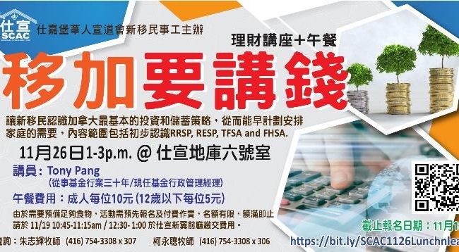 讓新移民認識加拿大最基本的投資和儲蓄策略,從而能早計劃安排家庭的需要,內容範圍包括初步認識RRSP, RESP, TFSA and FHSA。