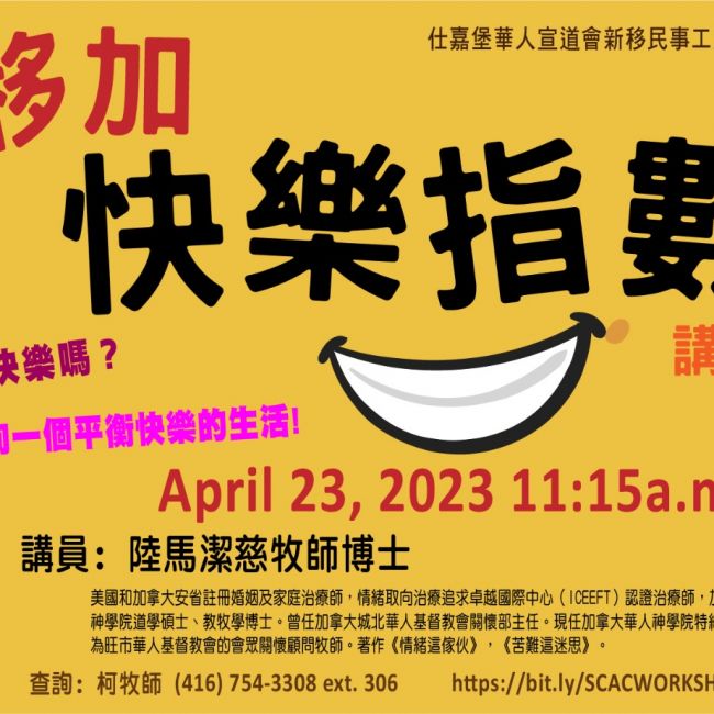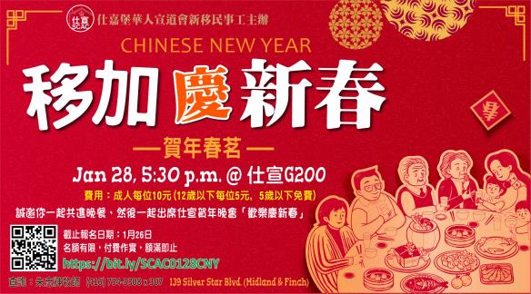 新移民事工活動: 「移加慶新春」賀年春茗。歡迎邀請新移民朋友一同吃晚飯和參與之後的教會新春活動。 詳情請參閱海報。
