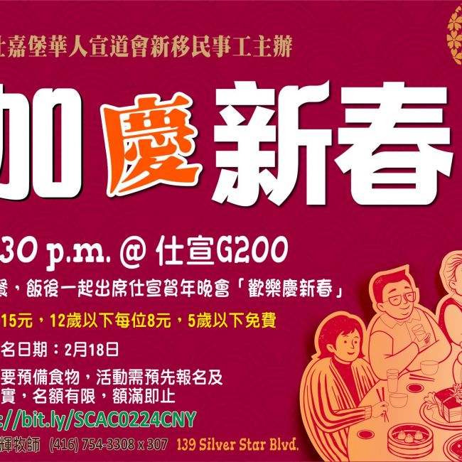 歡迎邀請新移民朋友一起共進晚餐和參與之後教會新春活動。 活動需預先報名及付費作實,名額有限。