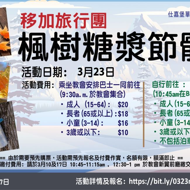 活動費用:乘坐教會安排巴士一同前往(9:30a.m.於教會集合)