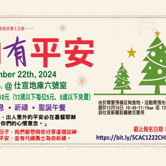 內容:包括詩歌、信息分享,歡迎所有新移民朋友參加,並一起共進聖誕午餐。因要預備足夠食物,需要預先報名與大家分享從神而來出人意外的平安,屆時有代禱勇士為新移民祈禱。