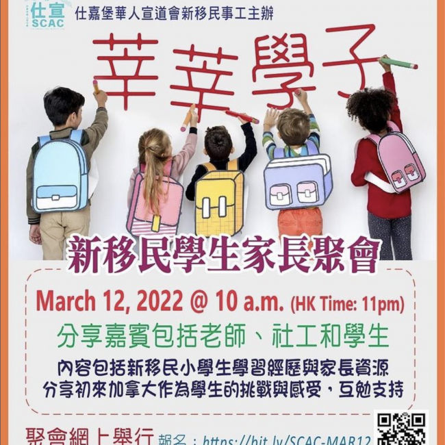 分享嘉賓包括老師、社工和學生。內容包括新移民小學生學習經歷與家長資源。分享初來加拿大作為學生的挑戰與感受,互勉支持。
