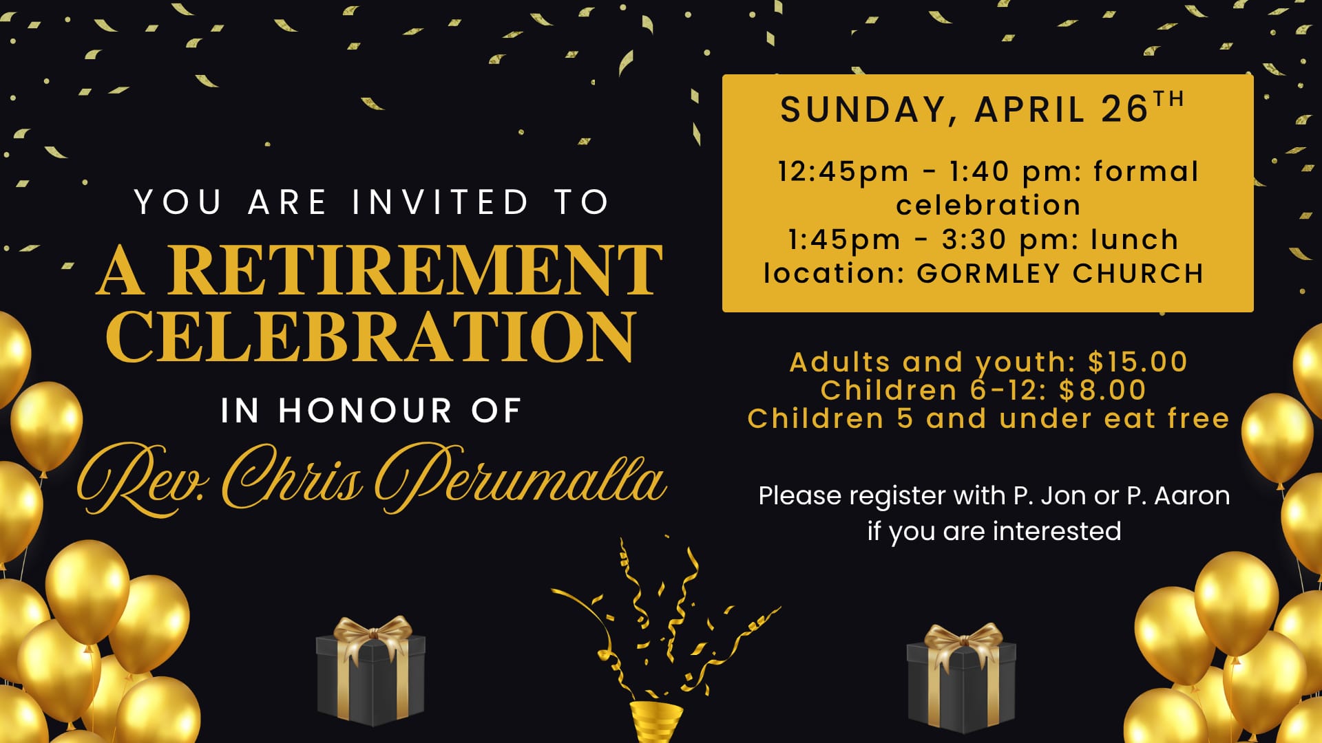 There will be a retirement celebration for Pastor Chris on Sunday, April 26 following the EM service at the Gormley Campus.