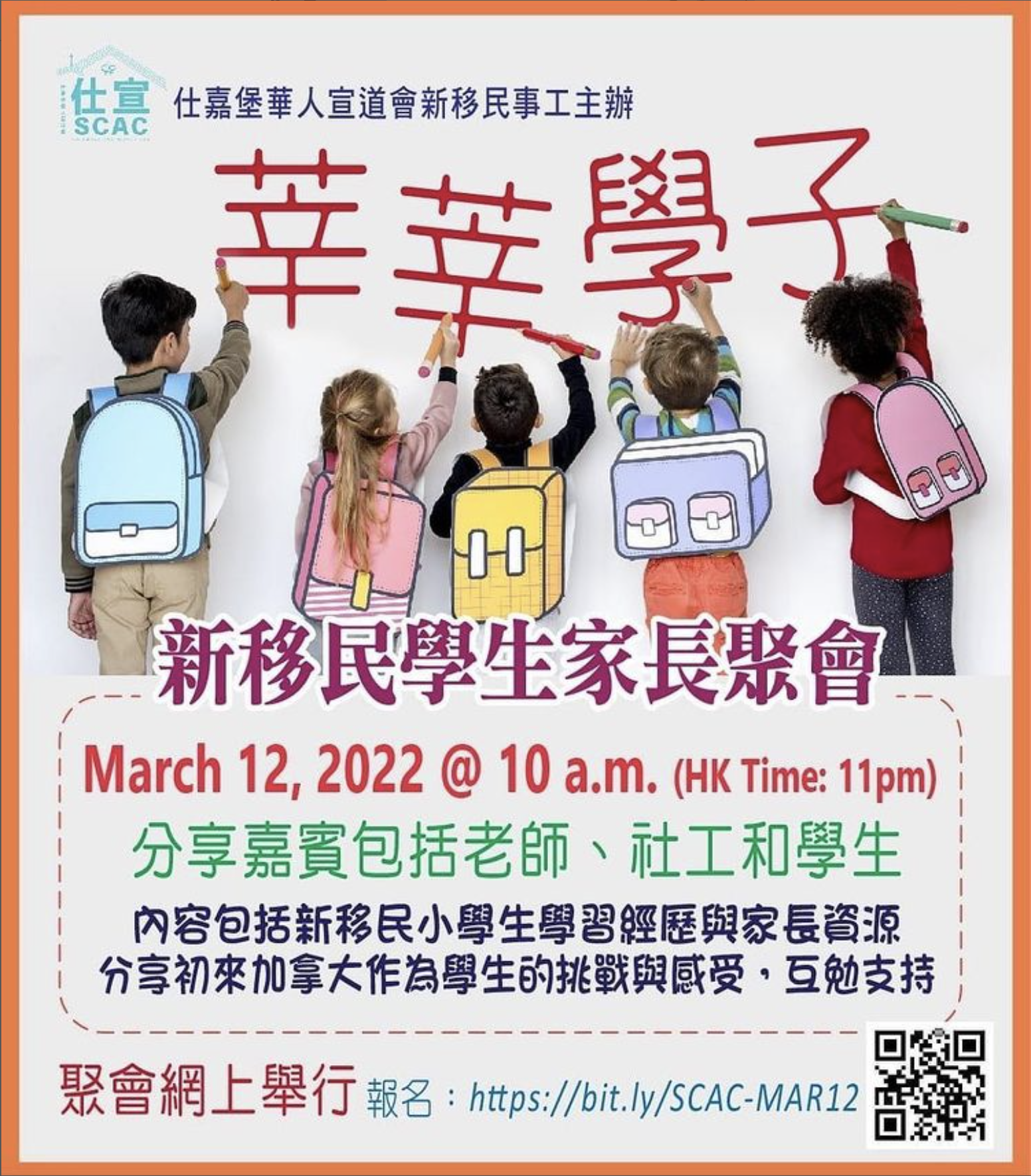 分享嘉賓包括老師、社工和學生。內容包括新移民小學生學習經歷與家長資源。分享初來加拿大作為學生的挑戰與感受,互勉支持。
