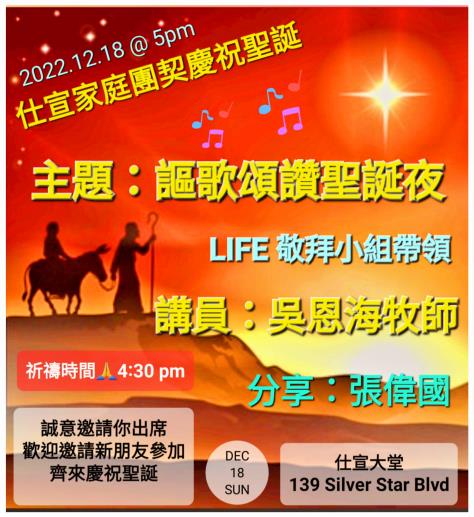 歡迎弟兄姊妹及新朋友參加,齊來慶祝聖誕.