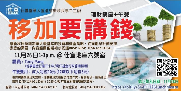 讓新移民認識加拿大最基本的投資和儲蓄策略,從而能早計劃安排家庭的需要,內容範圍包括初步認識RRSP, RESP, TFSA and FHSA。