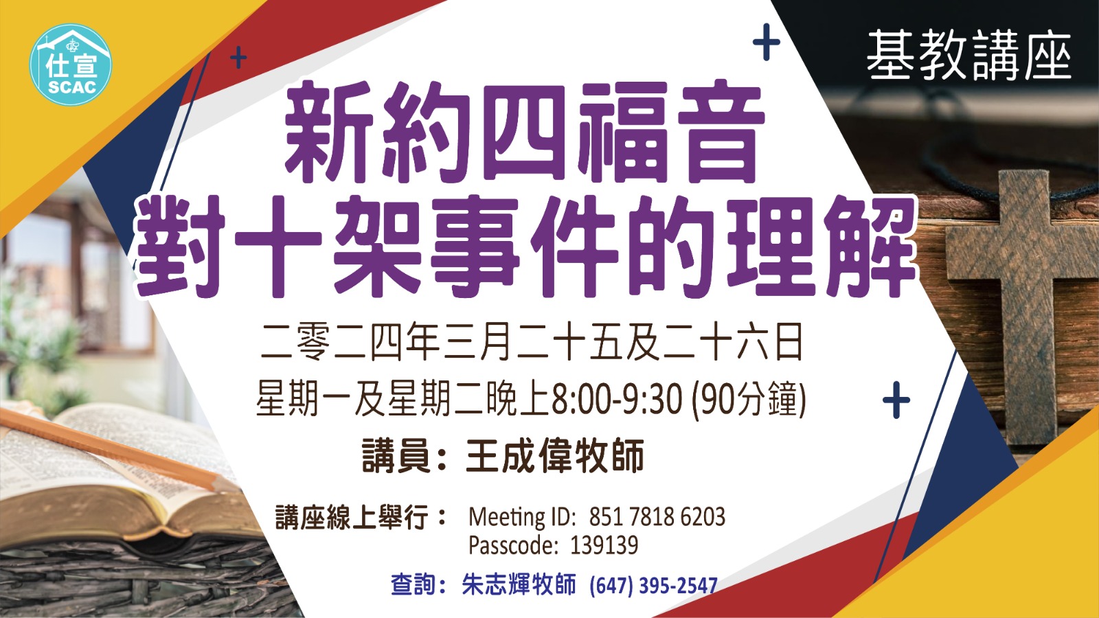 基教講座:新約四福音對十架事件的理解 日期:3 月 25-26 日 時間:晚上8:00-9:30(90分鐘) 講員:王成偉牧師 詳情請參閱海報